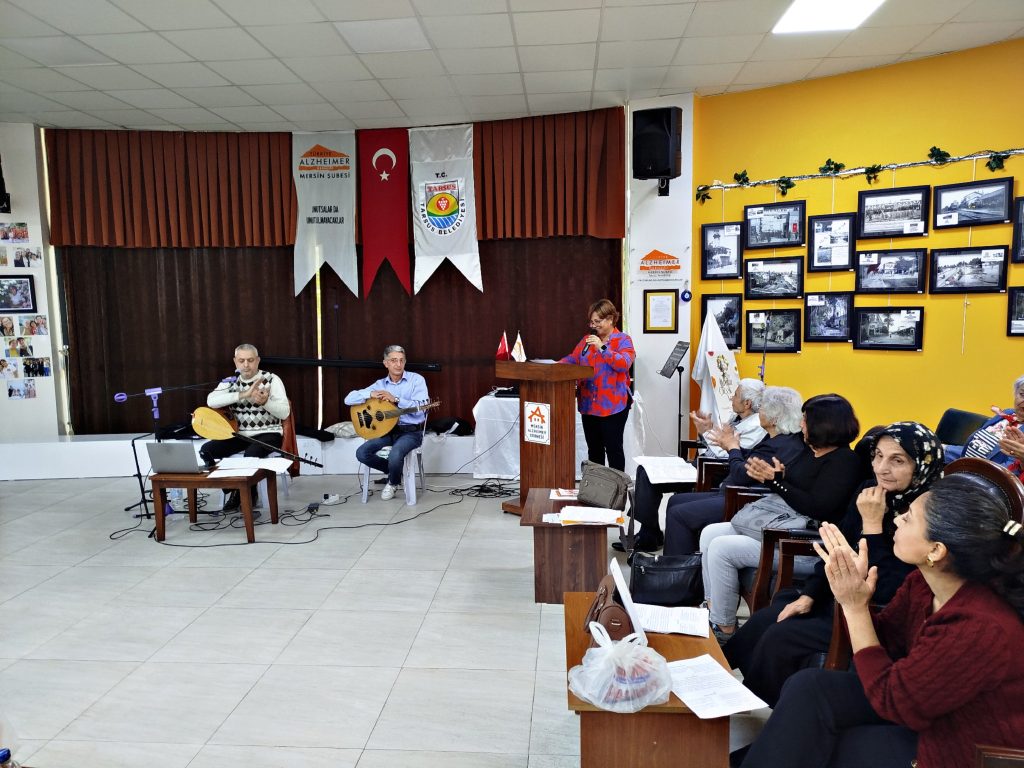 Mersin Alzheimer Derneği Tarsus Gönüllüleri ise yaptığı açıklamada; müziğin beynin mezolimbik bölgesindeki merkezleri uyararak, endorfin, oksitosin ve enkefalin gibi nörotransmitterlerin salgılanmasını tetiklediğini belirterek serotonin, dopamin, norepinefrin, melatonin, testesteron, kortizon gibi hormonların salınımınıda etkilediğini söyledi. Müziğin, görsel ve sözel becerileri geliştirdiğini, beynin sağlıklı kalmasını sağladığını, daha mutlu olmayı sağladığını, tansiyonu düzenlediğini, uyku kalitesini arttırdığını, ağrıları azalttığını ve sinir sistemini güçlendirdiğini ifade etti. Müziğin, duyguları ve anıları canlandırdığını bu nedenle müzik müdahalesinin Alzheimer hastalığı olan kişiler için terapötik faydaları olduğunu, müzik müdahalelerinin hastanın ajitasyonunu azalttığını, iletişimini ve bakım verenlerle ilişkilerini iyileştirdiğini dile getirdi. Bir Alzheimer hastasının çok sevdiği yakınlarının adını unutsada sevdiği şarkıları kolayca hatırladığına vurgu yaptı. Herkesi Ülker Aydın Yaşlı Dayanışma Evi’nde düzenledikleri çalışmalara davet etti.